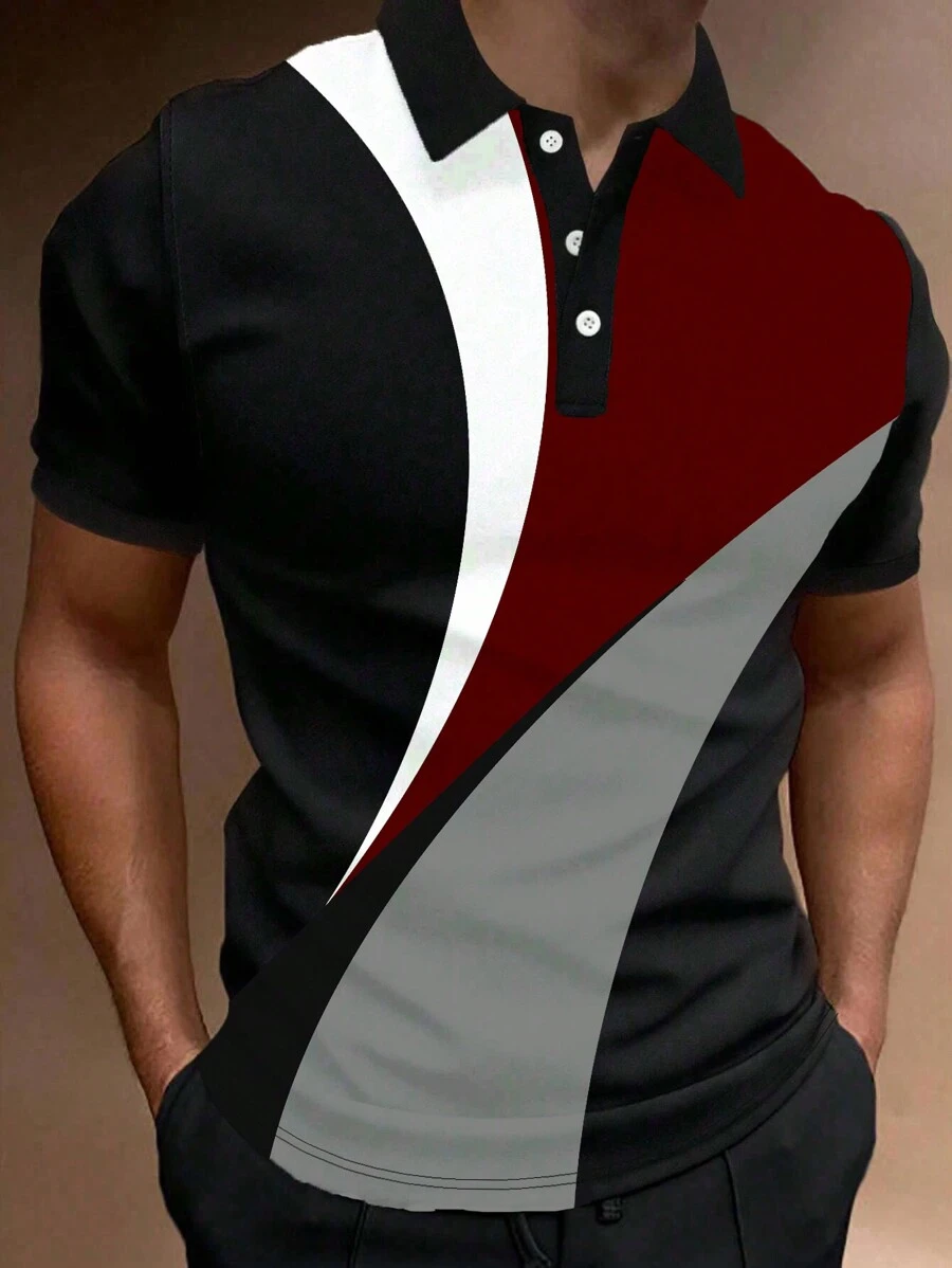 Contrast Color Business Casual Print Art Summer Short Sleeve Stretch Men's Polo Shirt