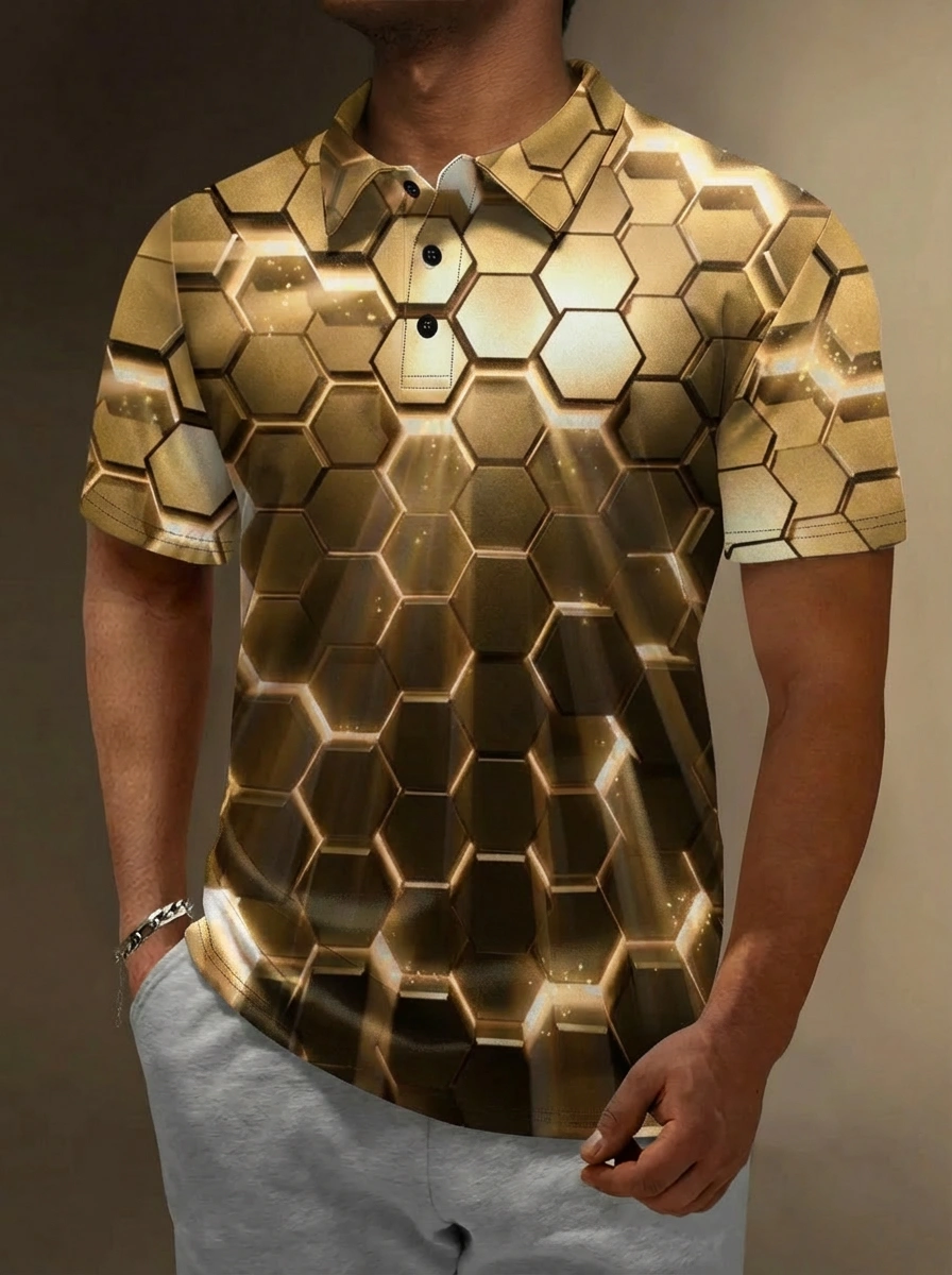 Moisture-wicking Gold Honeycomb 3D Reflective Button Short Sleeve Golf Polo Shirt