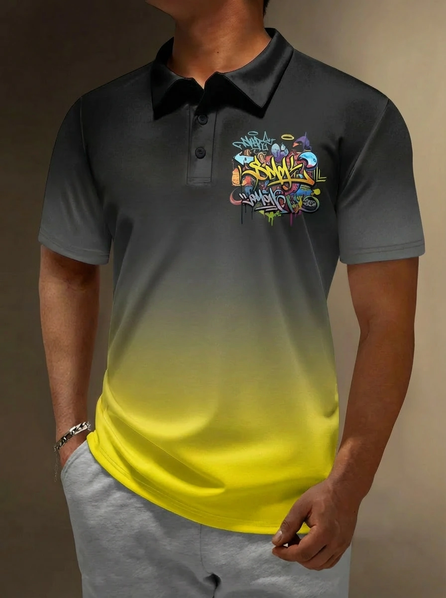 Moisture-wicking Black Yellow Ombre Street Graffiti Graphic Button Short Sleeve Golf Polo Shirt