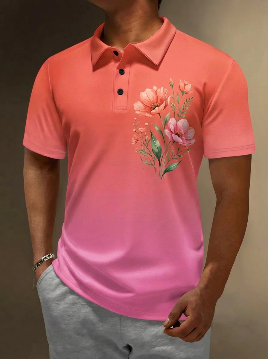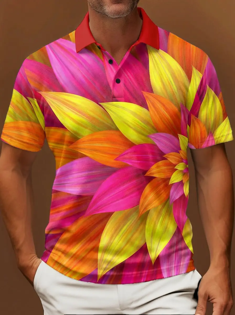 Red Orange Yellow Pink Gradient Floral Pattern Button Short Sleeve Golf Polo Shirt