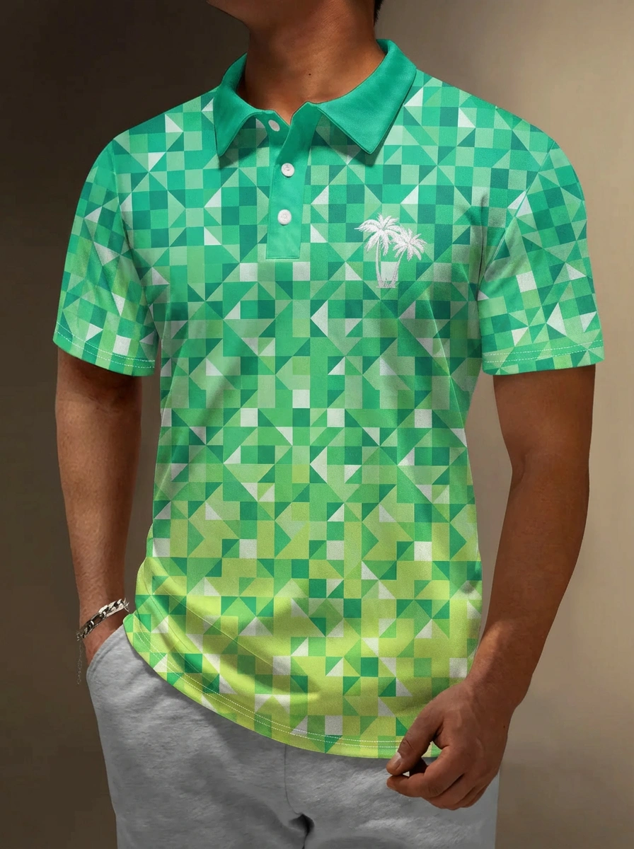Moisture-wicking Green White Geometric Triangle & Palm Tree Graphic Button Short Sleeve Golf Polo Shirt