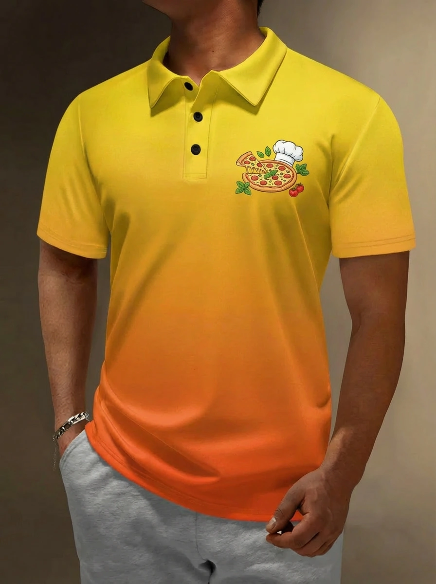 Moisture-wicking Yellow Orange Ombre Pizza Chef Graphic Button Short Sleeve Golf Polo Shirt