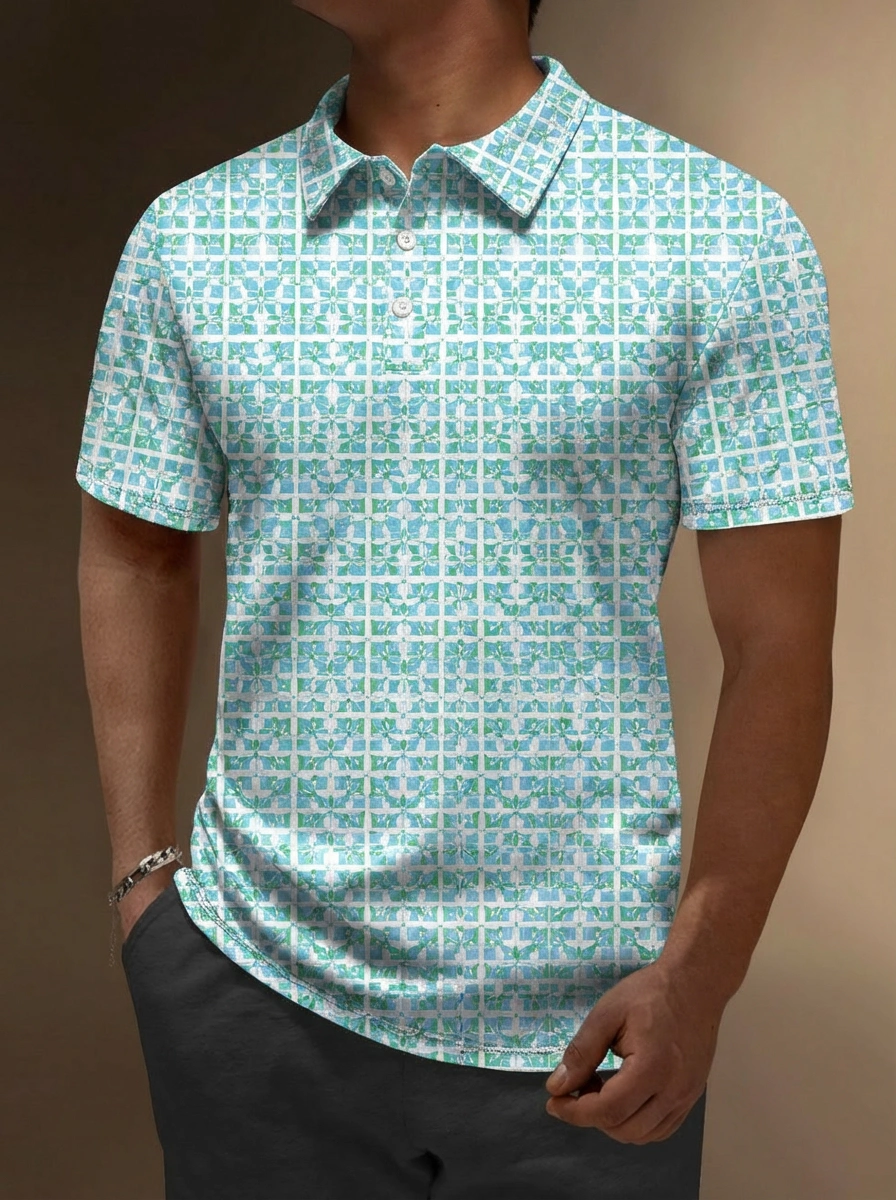 Moisture-wicking Blue Green White Geometric Grid Pattern Button Short Sleeve Golf Polo Shirt
