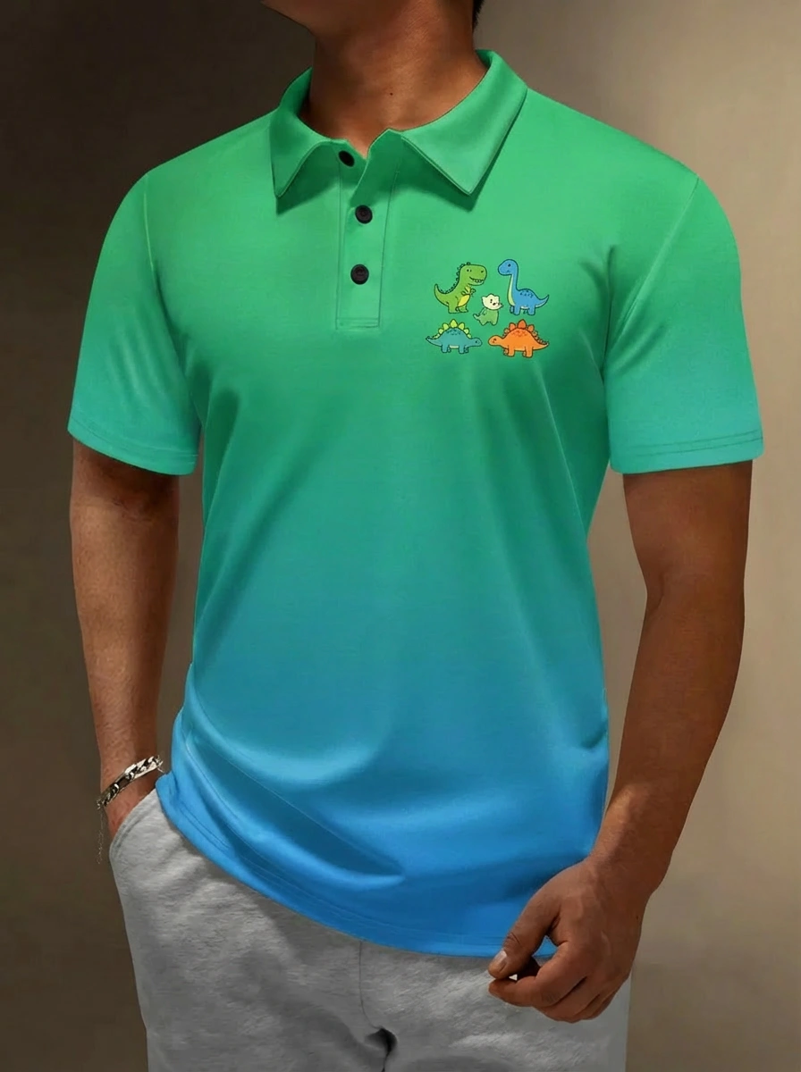 Moisture-wicking Green Blue Ombre Cartoon Dinosaur Graphic Button Short Sleeve Golf Polo Shirt