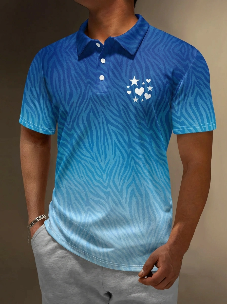 Moisture-wicking Blue Ombre Zebra Stripe & Heart Star Graphic Button Short Sleeve Golf Polo Shirt
