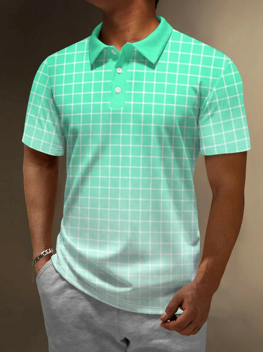Moisture-wicking Mint Green White Grid Check Button Short Sleeve Golf Polo Shirt
