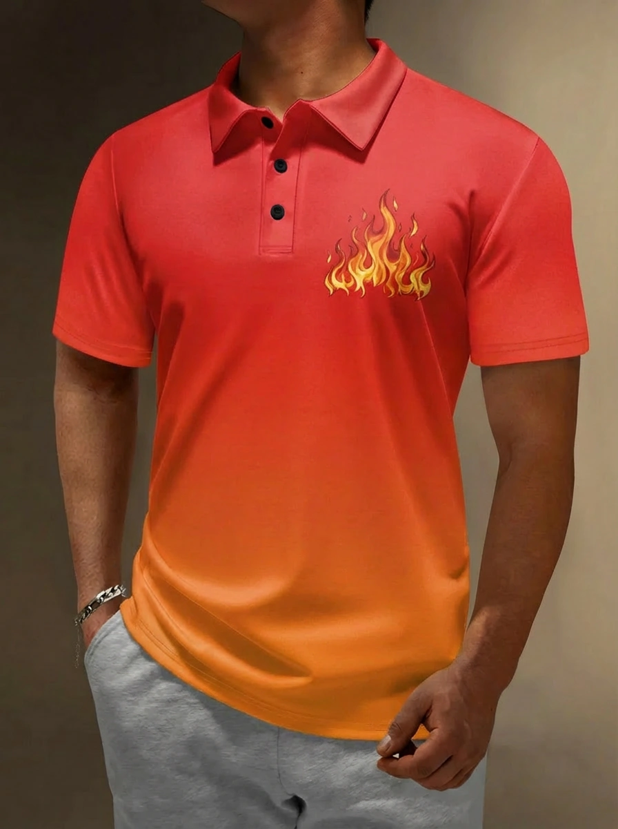 Moisture-wicking Red Orange Ombre Flame Graphic Button Short Sleeve Golf Polo Shirt