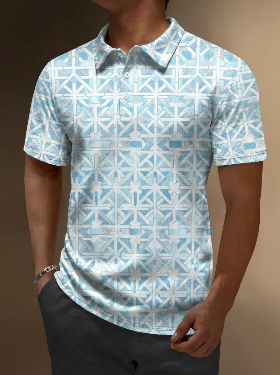 Moisture-wicking Blue White Geometric Grid Pattern Button Short Sleeve Golf Polo Shirt