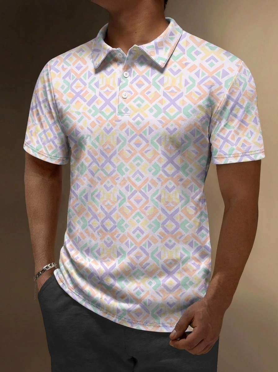 Moisture-wicking Pastel Color Geometric Diamond Pattern Button Short Sleeve Golf Polo Shirt