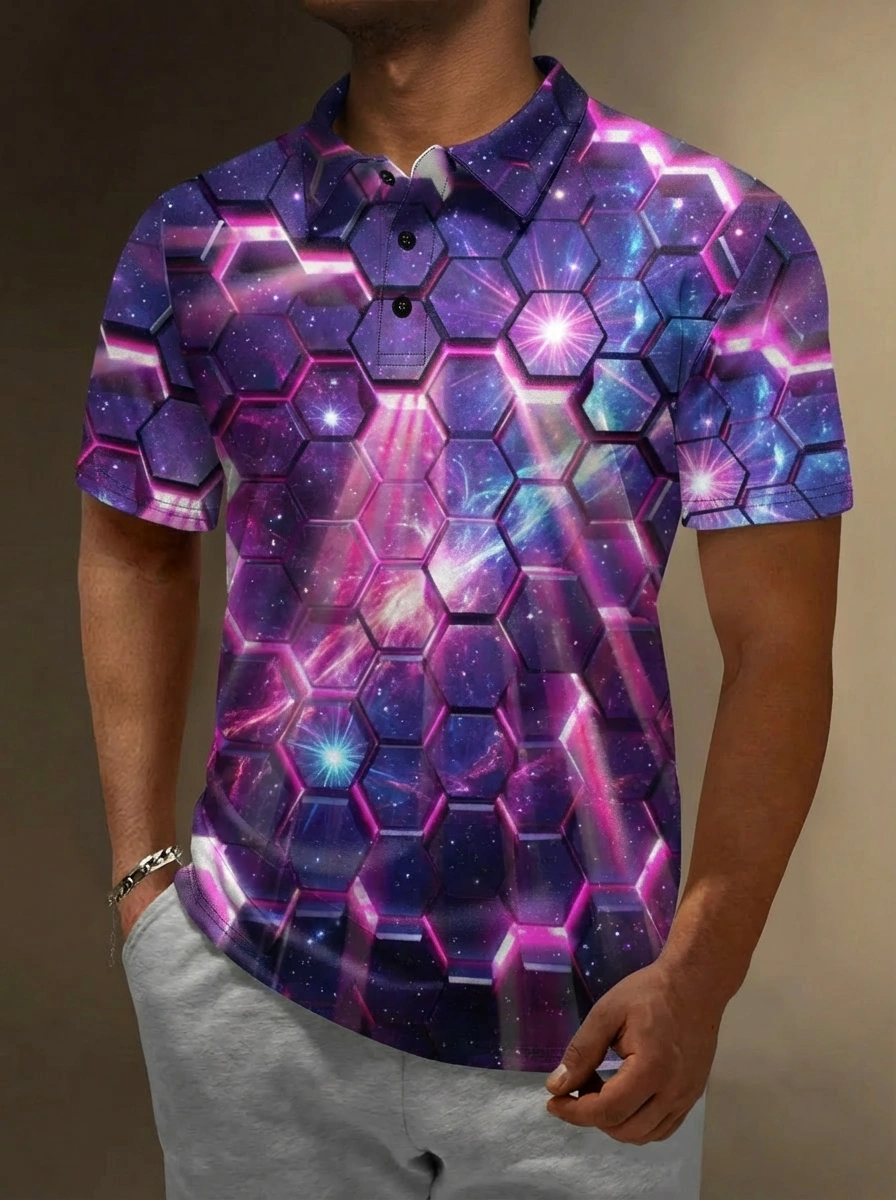 Moisture-wicking Purple Pink Honeycomb Galaxy Pattern Button Short Sleeve Golf Polo Shirt
