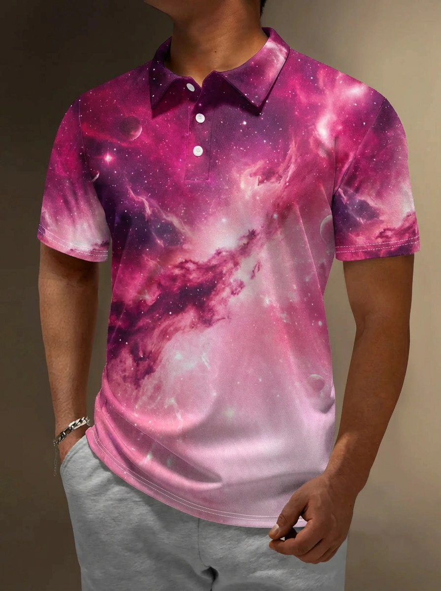 Moisture-wicking Pink Purple Ombre Galaxy Pattern Button Short Sleeve Golf Polo Shirt