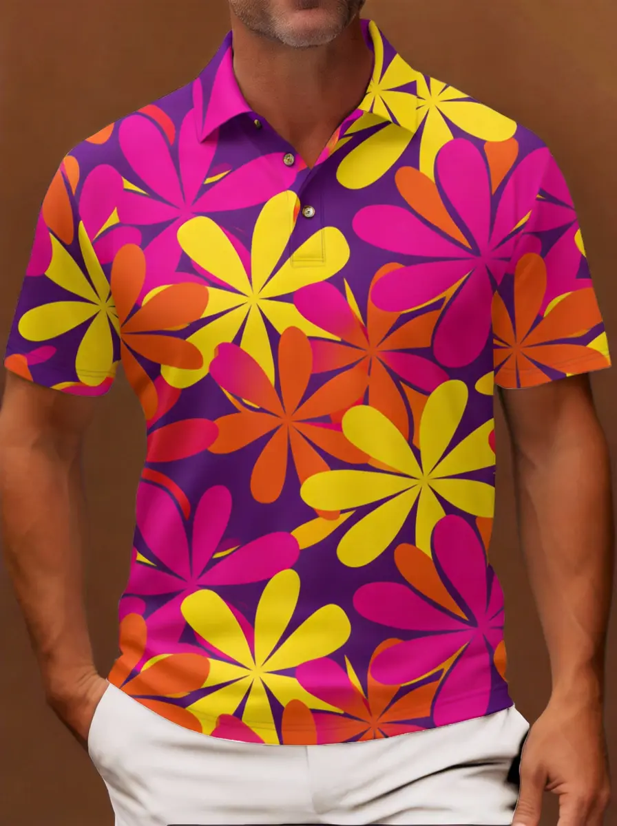 Purple Pink Yellow Orange Floral Pattern Button Short Sleeve Golf Polo Shirt