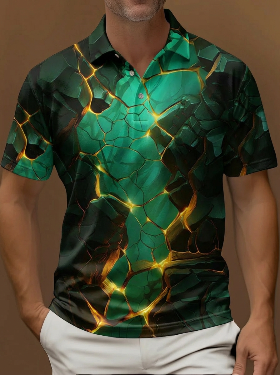 Cool Sci-Fi Golden Light And Broken Green Stones Printing Short Sleeve Polo