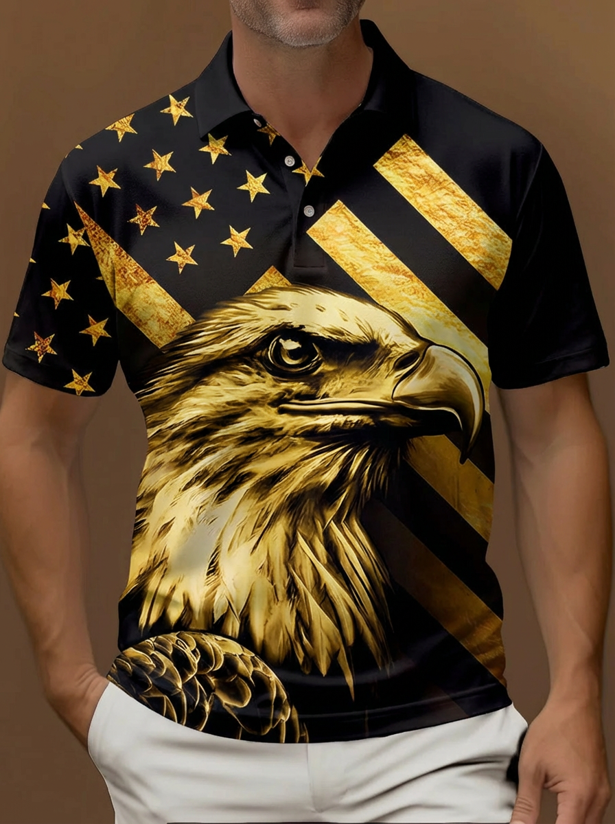 Black Gold Stars And Stripes Eagle Pattern Printing Short Sleeve Polo
