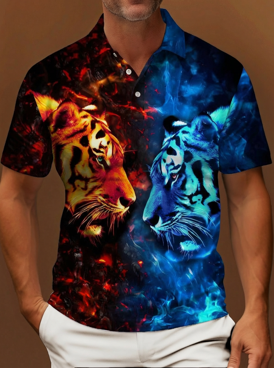 Stunning Style Fire And Ice Tiger Art Painting Printing Short Sleeve Polo