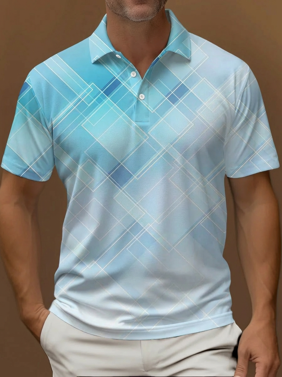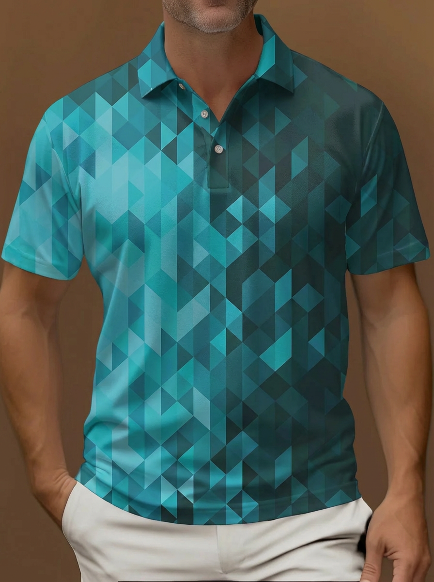 Business Style Blue Gradient Abstract Geometric Pattern Printing Short Sleeve Polo