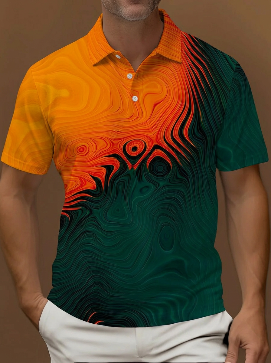 Abstract Orange And Green Gradient Marble Texture Printing Short Sleeve Polo
