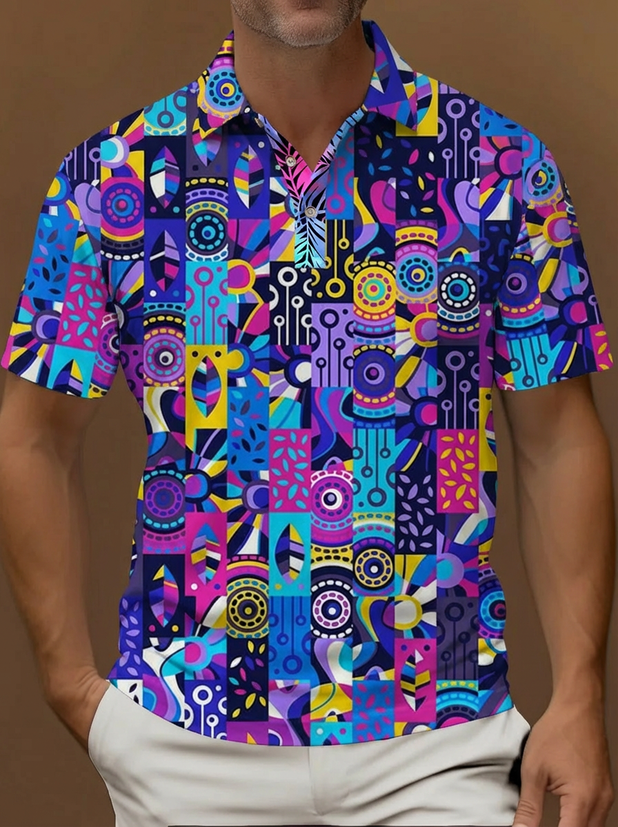 Purple Colorful Geometric Mosaic Pattern Printing Short Sleeve Polo