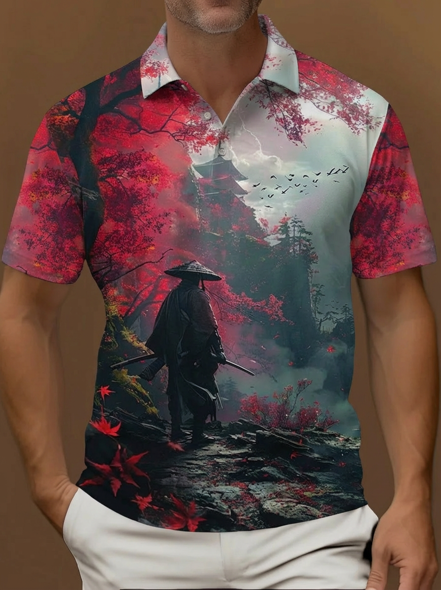 Ukiyoe Bushido Cherry Blossoms And Samurai Printing Short Sleeve Polo