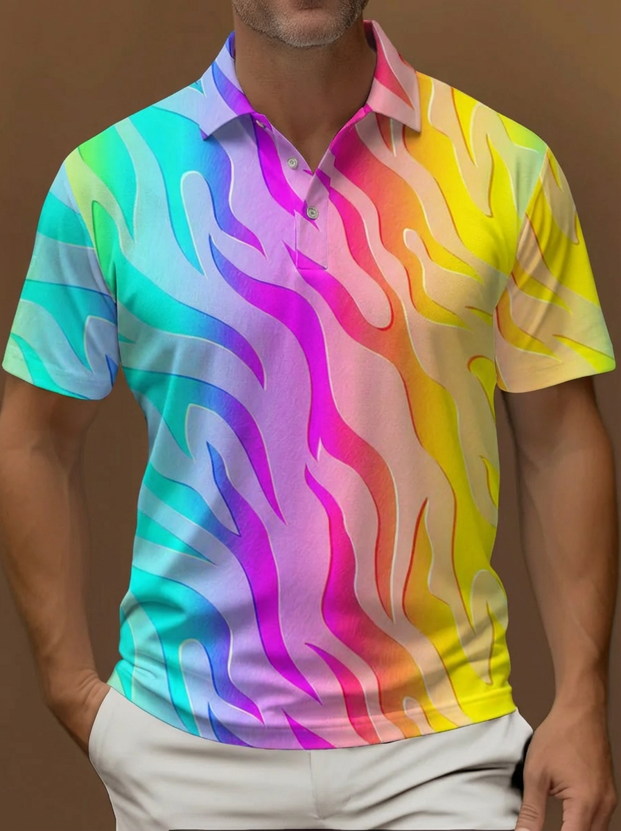Abstract Trendy Neon Rainbow Flame Pattern Printing Short Sleeve Polo