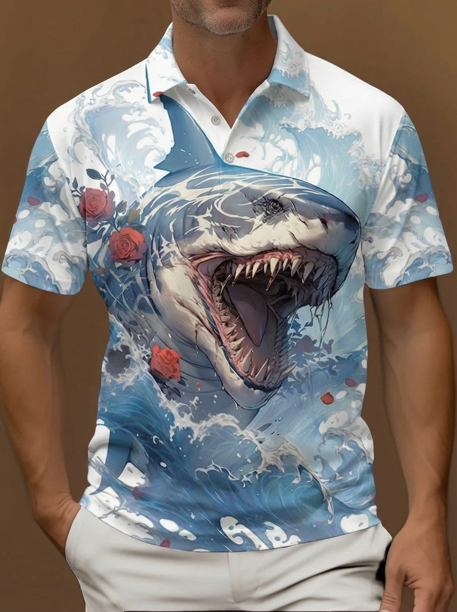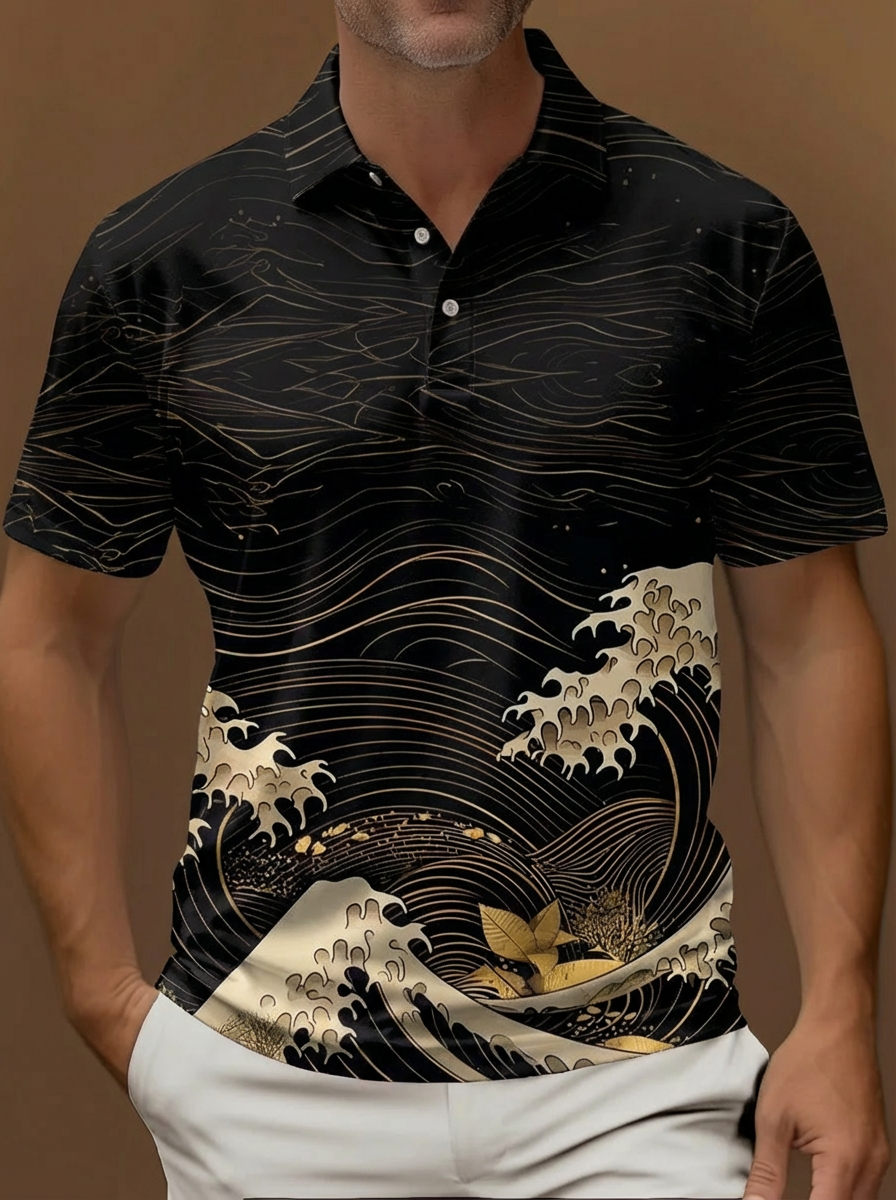 Ukiyo-E Retro Ocean Waves And Gold Leaves Printing Short Sleeve Polo