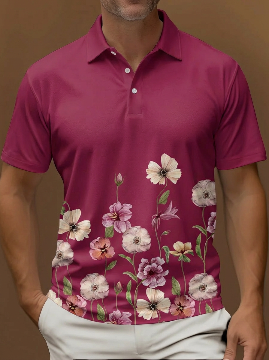 Purple Pink Yellow Orange Floral Pattern Button Short Sleeve Golf Polo Shirt