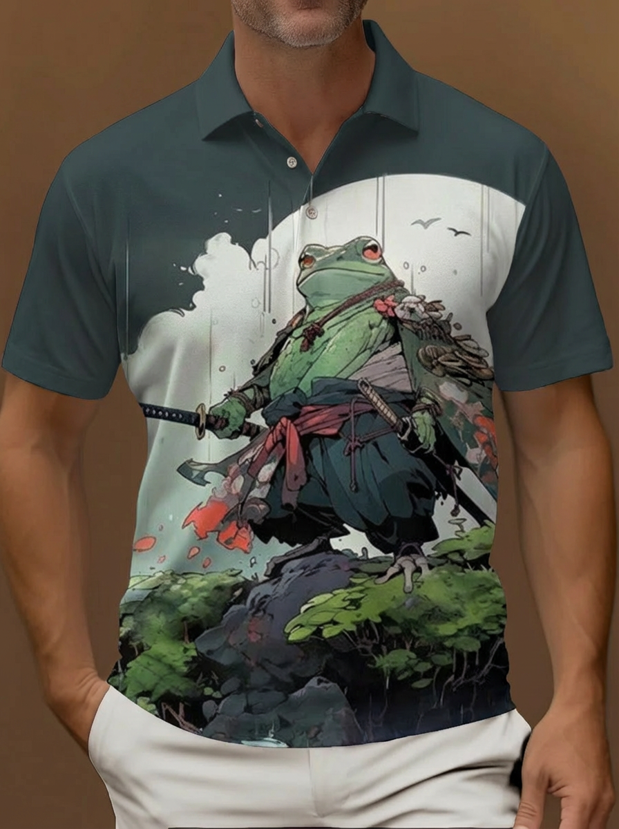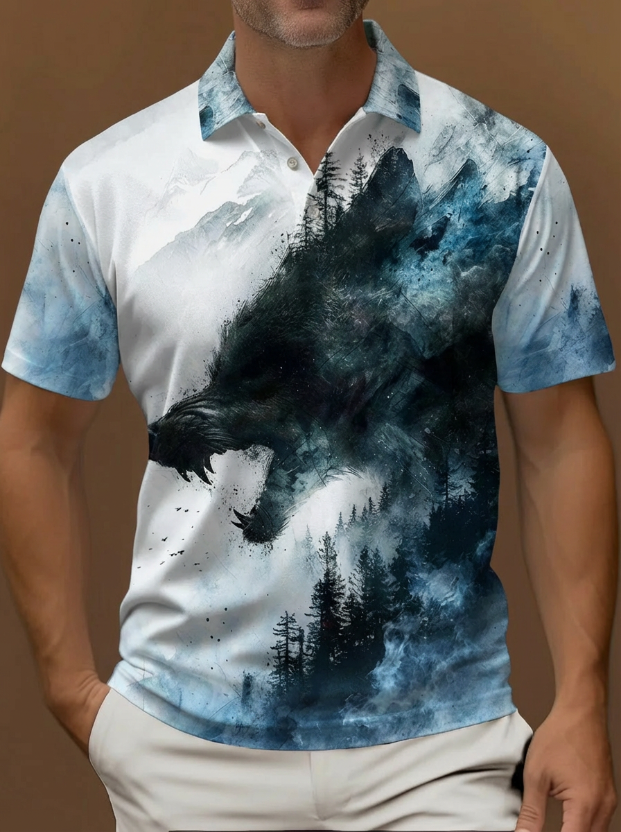 Mysterious Oriental Wonderland Ink Landscape Painting Printing Short Sleeve Polo