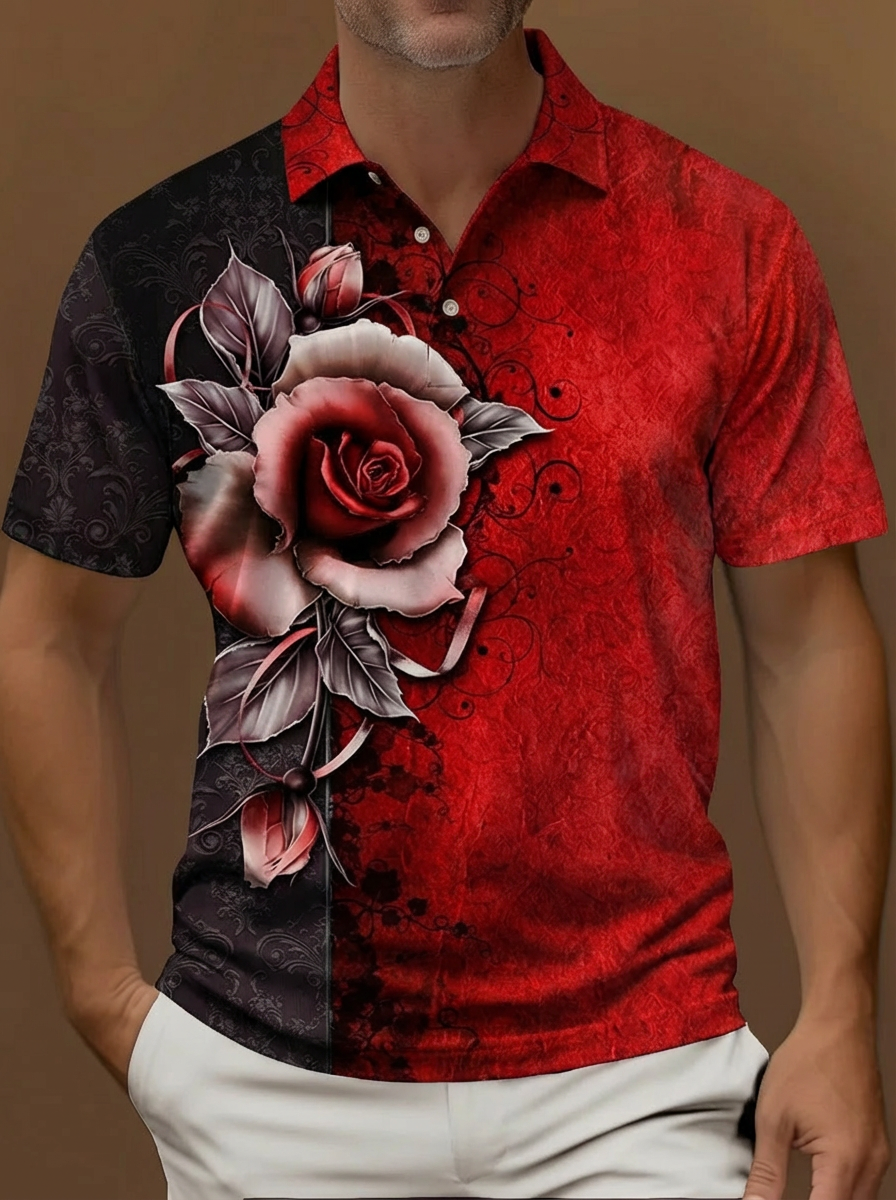 Red Orange Yellow Pink Gradient Floral Pattern Button Short Sleeve Golf Polo Shirt