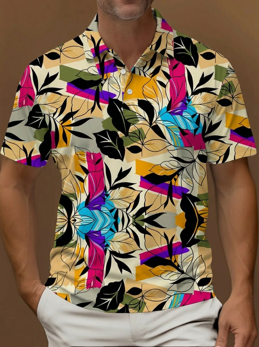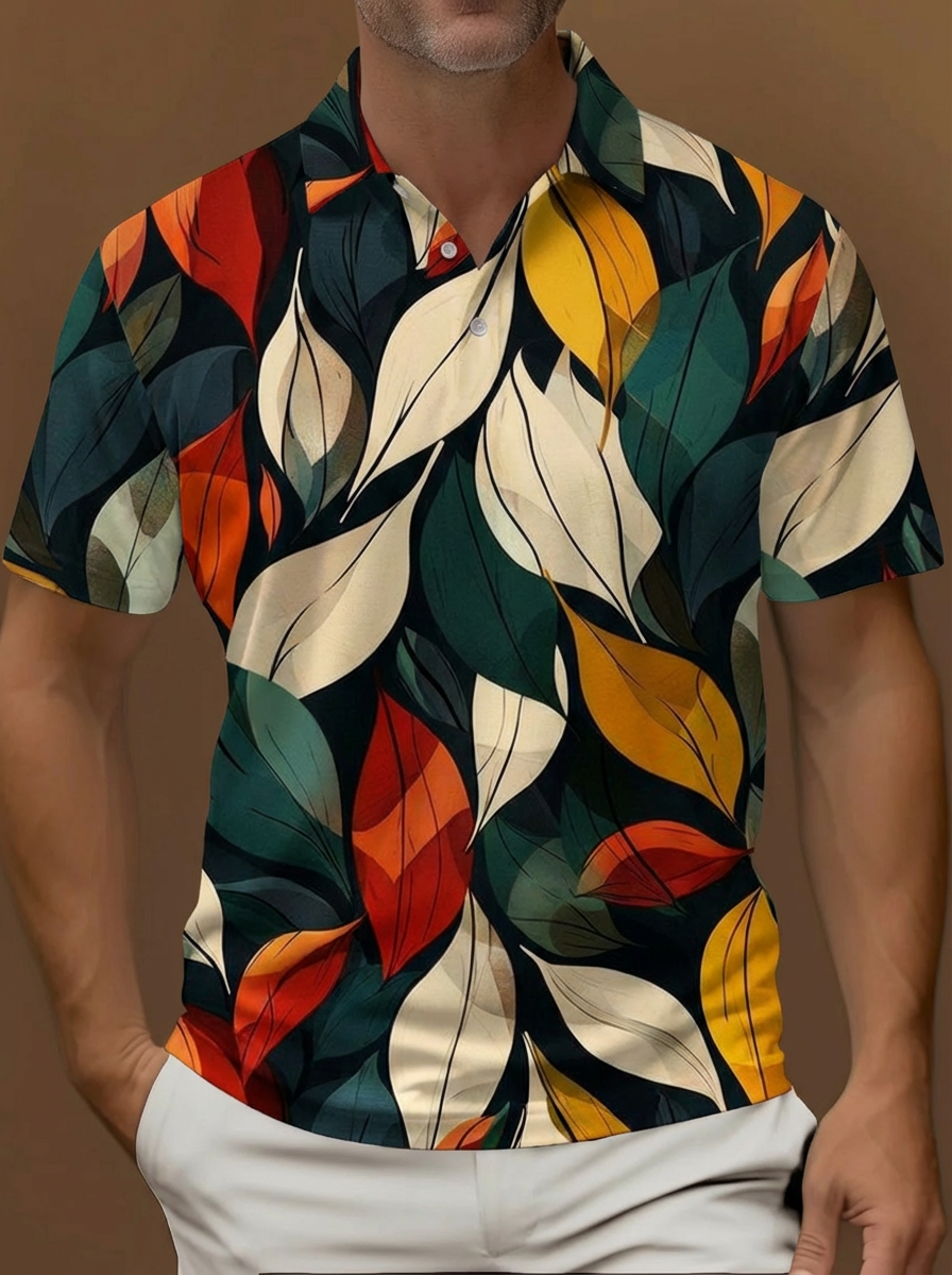 Abstract Retro Linear Lines Colorful Leaves Pattern Printing Short Sleeve Polo