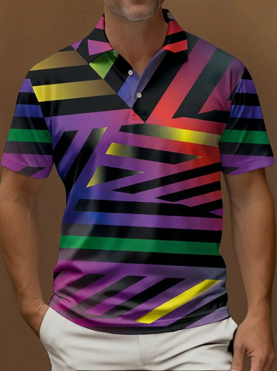 Op Art Abstract 80s Colorful Geometric Line Background Printing Short Sleeve Polo