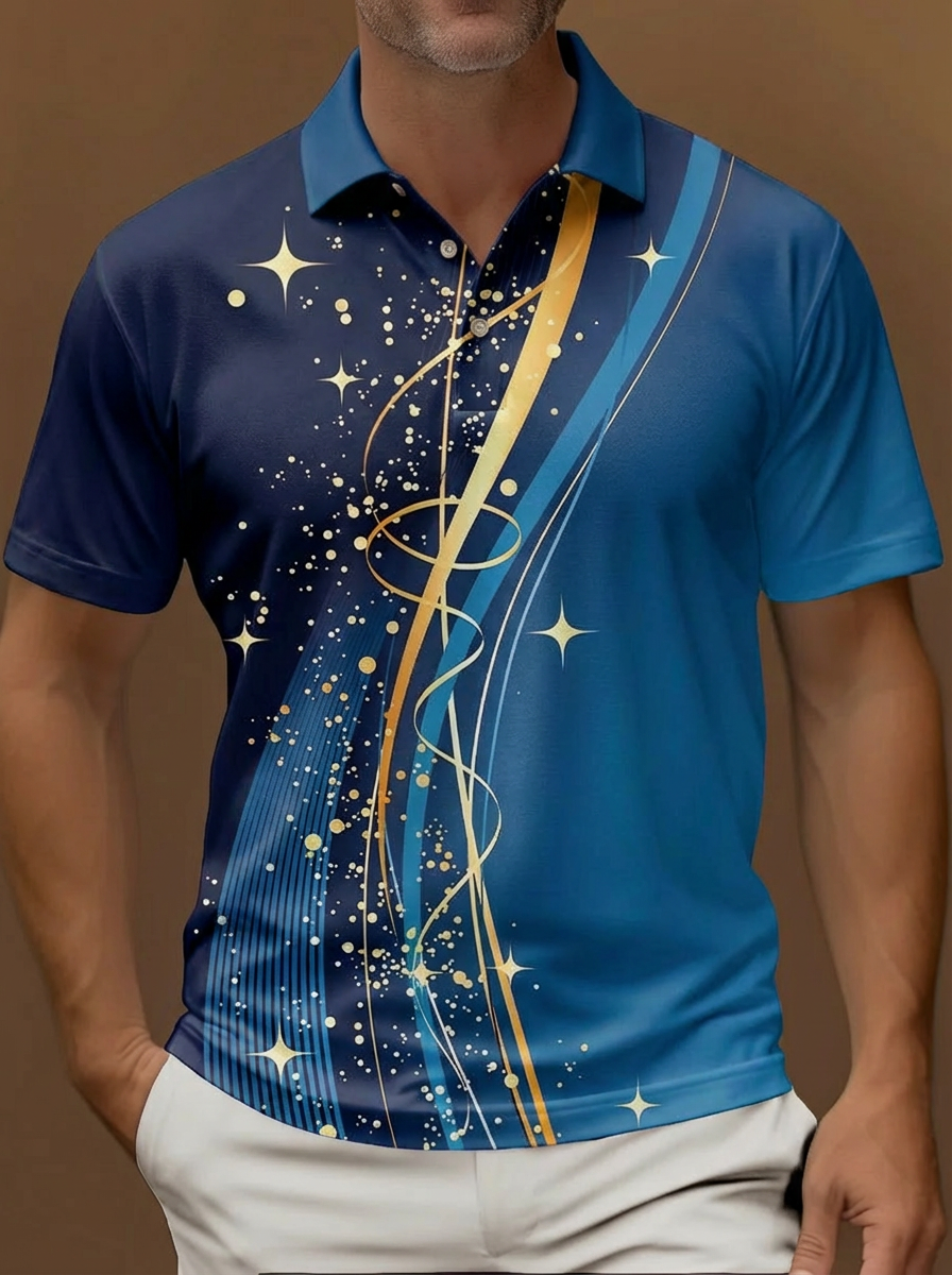 Vintage Gradient Blue And Gold Stripes Pattern Printing Short Sleeve Polo