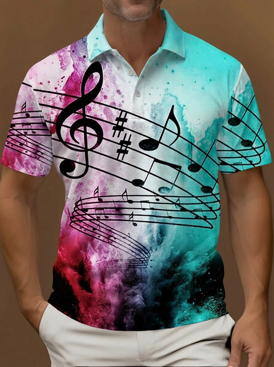 Summer Hawaiian Colorful Tie Dye Background Music Notes Printing Short Sleeve Polo